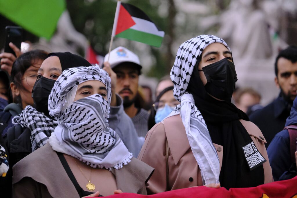 She was confronted again by one of the men who stole a sign she carried, which said: “No Tolerance For Jew Hatred.” He tore it up as she tried to retrieve it and pinned her by the throat.